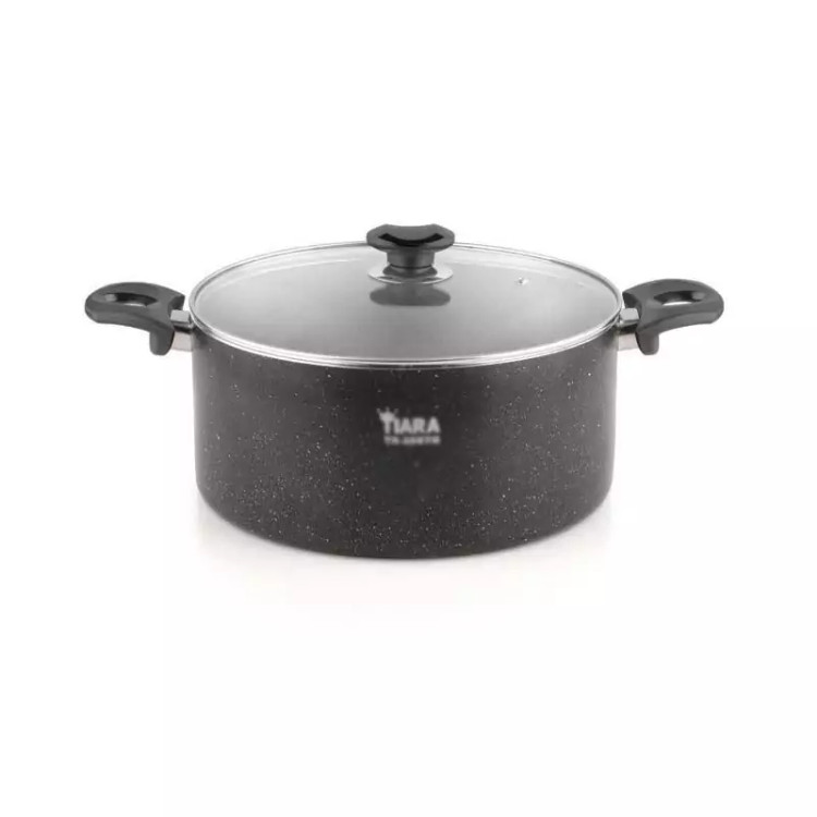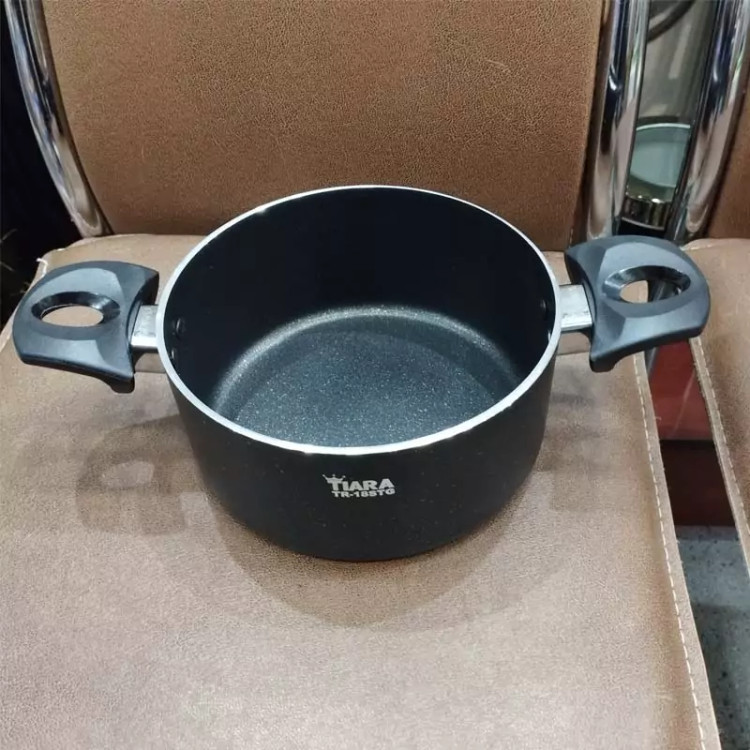 قابلمه سایز 16 گرانیت دو رو تیارا، جنس بدنه از آلومینیوم با پوشش نچسب گرانیت، دسته و قپه پلاستیک نسوز (باکالیت)، درب شیشه ای با حاشیه استیل نگیر است. این محصول مناسب پخت انواع غذا می باشد.