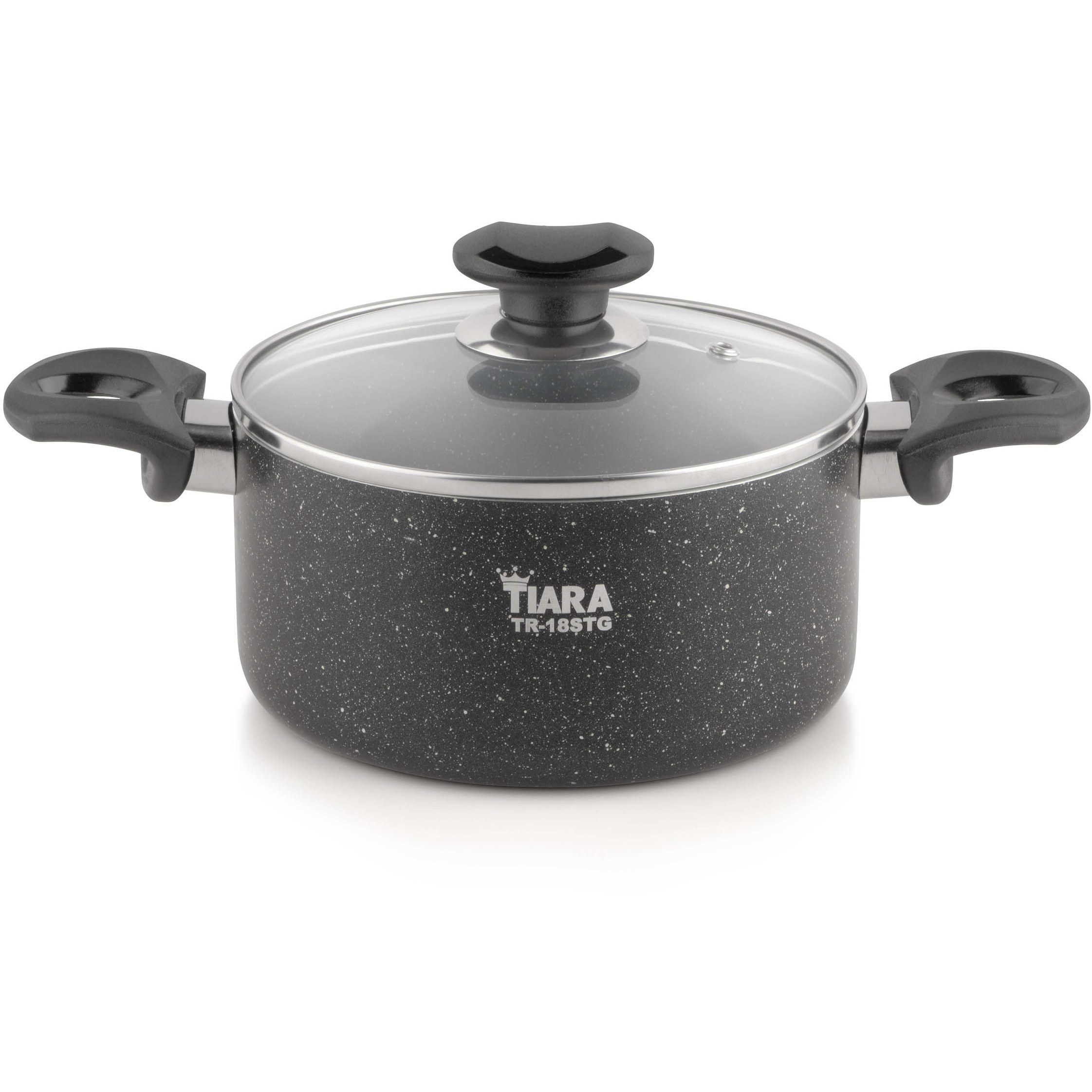 قابلمه سایز 18 گرانیت دو رو تیارا، جنس بدنه از آلومینیوم با پوشش نچسب گرانیت، دسته و قپه پلاستیک نسوز (باکالیت)، درب شیشه ای با حاشیه استیل نگیر است. این محصول مناسب پخت انواع غذا می باشد.