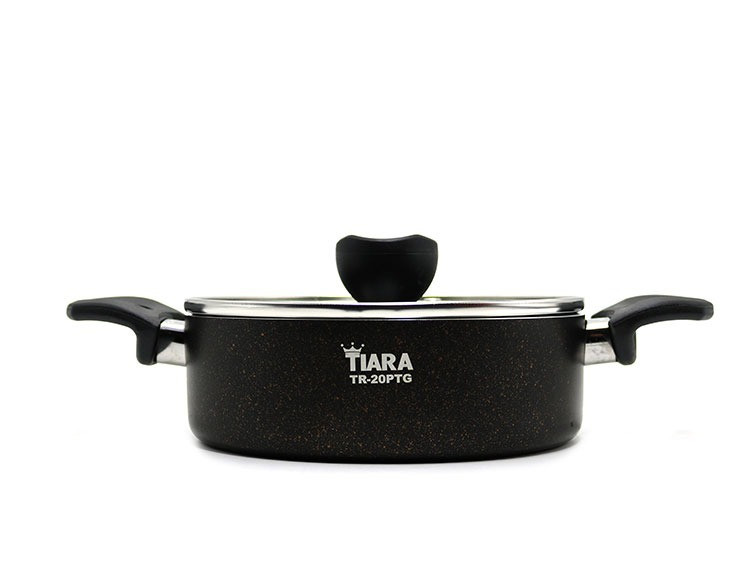 تابه سایز 20 دو دسته درب دار گرانیت تیارا، جنس بدنه از آلومینیوم با پوشش نچسب گرانیت، دسته و قپه پلاستیک نسوز (باکالیت)، درب شیشه ای با حاشیه استیل نگیر است. این محصول مناسب پخت انواع غذا می باشد.