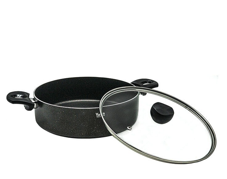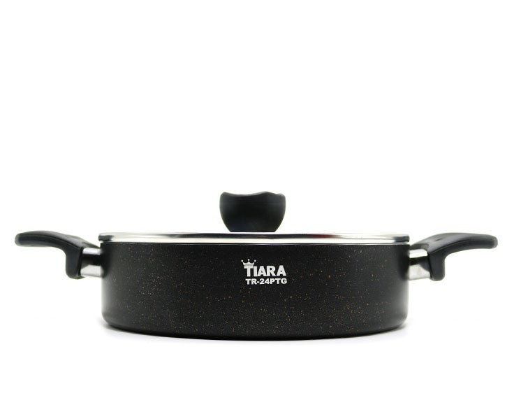 تابه سایز 32 دو دسته درب دار گرانیت تیارا، جنس بدنه از آلومینیوم با پوشش نچسب گرانیت، دسته و قپه پلاستیک نسوز (باکالیت)، درب شیشه ای با حاشیه استیل نگیر است. این محصول مناسب پخت انواع مواد غذایی می باشد.