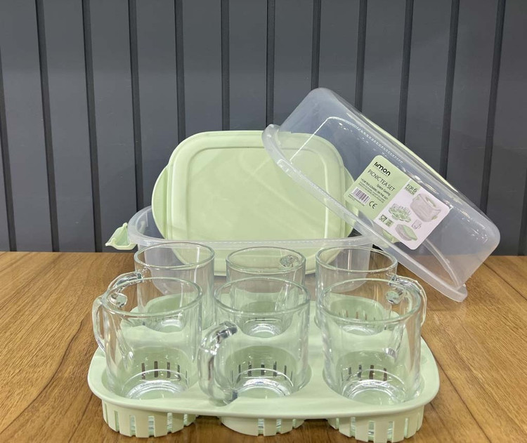 اقلام داخل بسته : 6 عدد لیوان شیشه ای دسته دار + سینی سرو + نظم دهنده 3 قسمته + باکس حمل