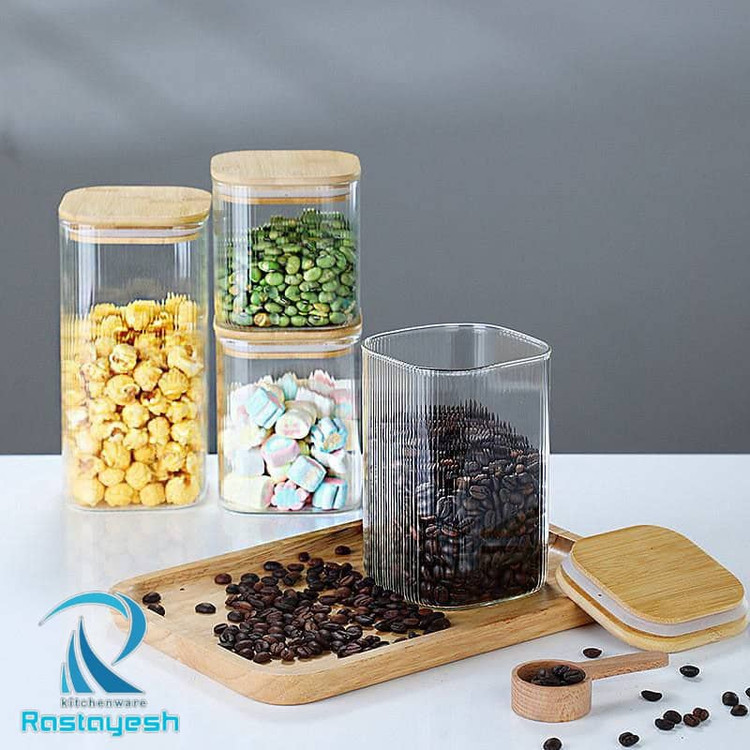 بانکه شیشهای مربعی با درب چوبی بامبو | نگهداری ادویه، حبوبات و دمنوش با طراحی مینیمال