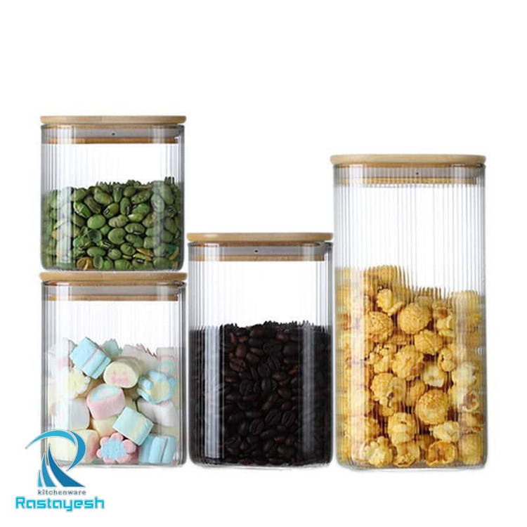 بانکه شیشهای مربعی با درب چوبی بامبو| نگهداری ادویه، حبوبات و دمنوش با طراحی مینیمال